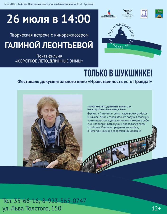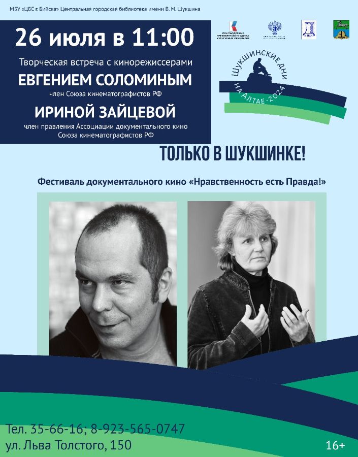 Член правления Ассоциации документального кино Союза кинематографистов РФ Ирина Зайцева и член Союза кинематографистов РФ Евгений Соломин проведут встречи со зрителями в Центральной городской библиотеке имени В. М. Шукшина в Бийске.