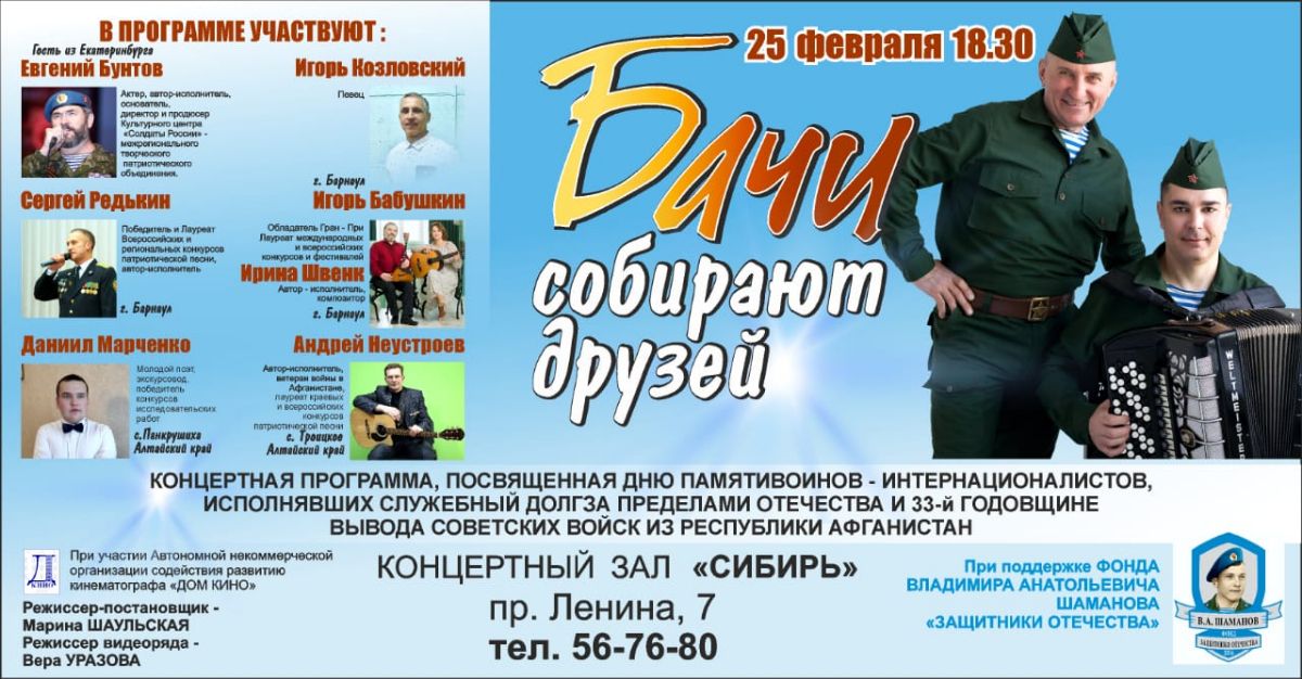 Группа "Бачи" собирает друзей на концерт, посвященный выводу войск из Афганистана. Мы помогаем нашим друзьям в организации и проведении этого патриотического мероприятия. Ждём всех, кому небезразлична судьба нашего Отечества.