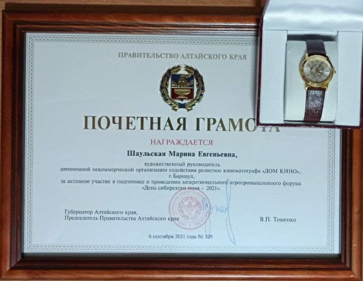 Сегодня в малом зале Правительства Алтайского края состоялось вручение наград Алтайского края за активное участие в подготовке и проведении Агрофорума "День Сибирского поля 2021". Почетной грамотой Губернатора Алтайского края была награждена художественный руководитель АНО "ДОМ КИНО" Марина Шаульская, за прекрасную работу в качестве режиссера-постановщика торжественной церемонии открытия агрофорума. Поздравляем!