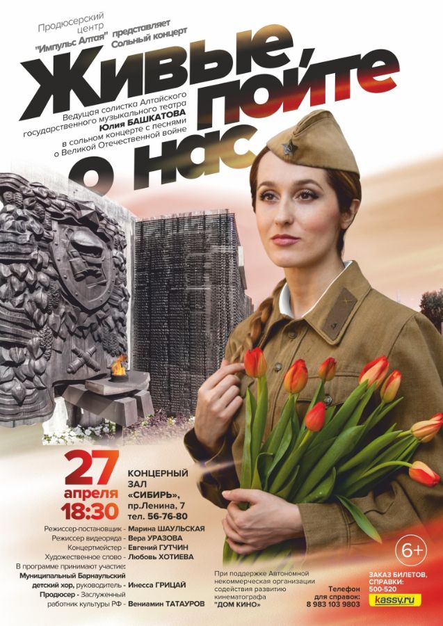 27 апреля в КЗ "Сибирь" г. Барнаула, состоится концерте Юлии Башкатовой "Живые, пойте о нас". Организатором выступил Продюсерский центр "Импульс Алтая". АНО "ДОМ КИНО" занимается подготовкой программы.